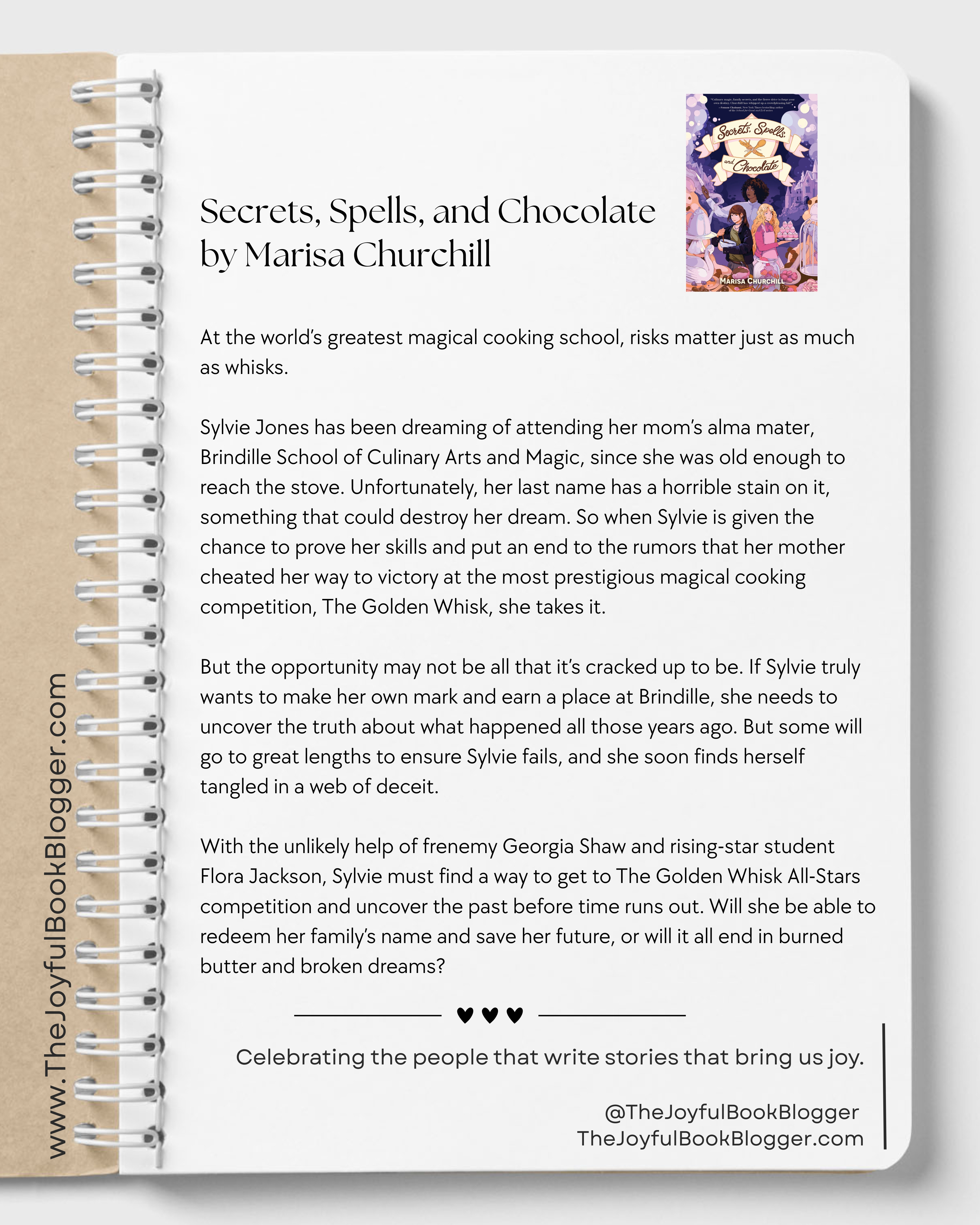 Secrets, Spells, and Chocolate by Marisa Churchill | 400 pages Pub Date 12/9/25 by Page Street YA | Book jacket description below | I received a gifted PR box with an Advanced Review Copy and some yummy treats. Opinions shared are always my own!