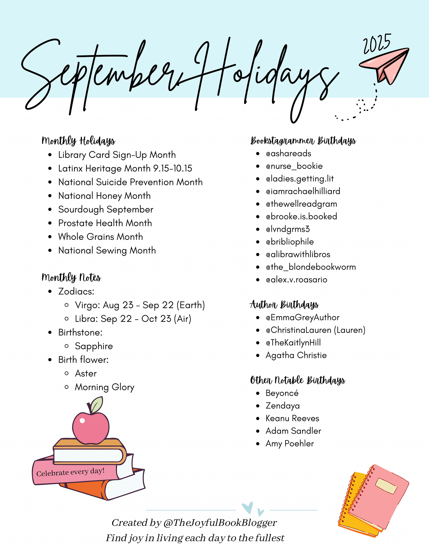 Starting off with the fun extras — these are available to everyone to view and save. Below you’ll find all of the month-long holidays along with notable birthdays of bookstagrammers, authors, and other celebrities.